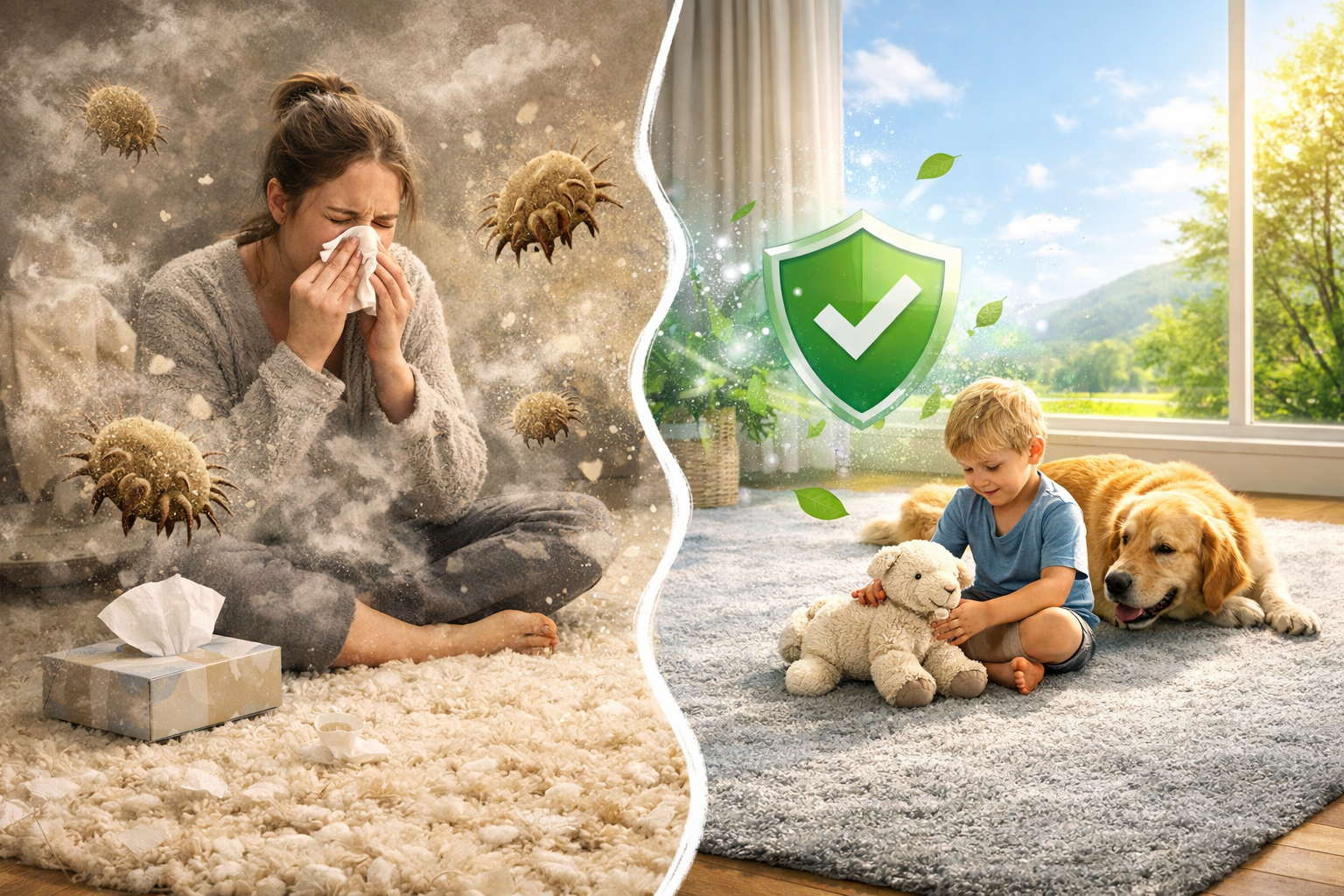 Indoor allergies are usually triggered less by the carpet itself and more by what settles into it over time, dust, pet dander, pollen, and the waste from dust mites.